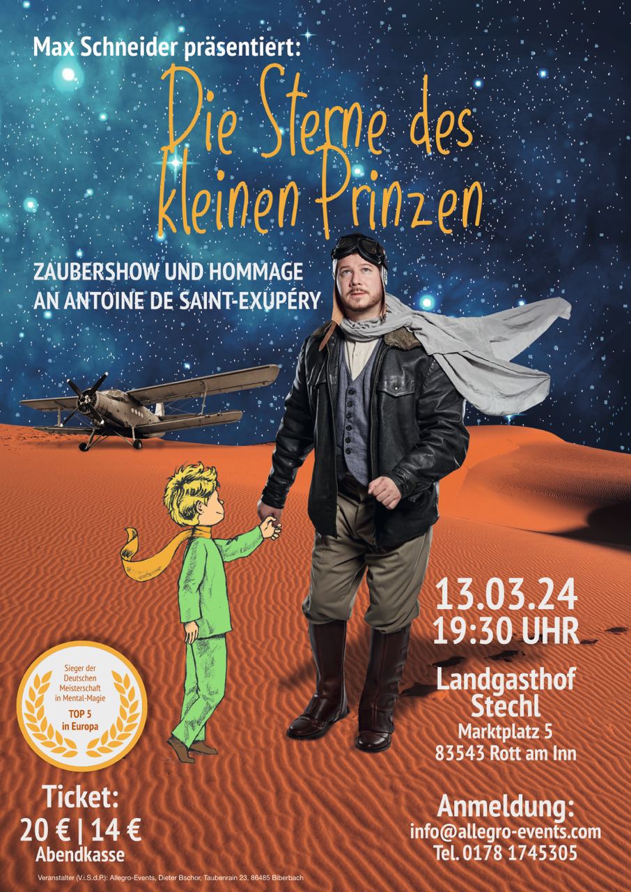 13Mär19:3021:30ZAUBERSHOW mit dem Profi-Magier Max Schneider in Rott am InnLiterarische ZAUBERHOMMAGE an Antoine de Saint Exupury "Die Sterne des kleinen Prinzen""