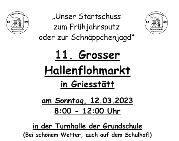 Der 11. Große Hallenflohmarkt in Griesstätt (bei schönem Wetter auch auf dem Außengelände der Schule) findet am Sonntag, 12. März, von 8 bis 12 Uhr statt.