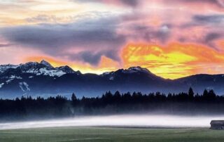 Stimmungsvoll festgehalten: Die Poesie der Abendsonne, der Nebelschwaden über den Feldern und der Berge im Hintergrund